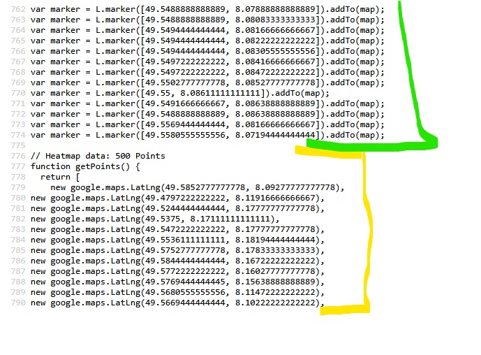Die Heatmap wurde so modifiziert, das eine halbautomatische Erzeugung möglich ist. WiresX2Web kann leider die Heatmap nur im Google Maps Format erzeugen. Ich kopiere die Koordinaten aus der generierten heatmap.html(Abschnitt get_Points) und